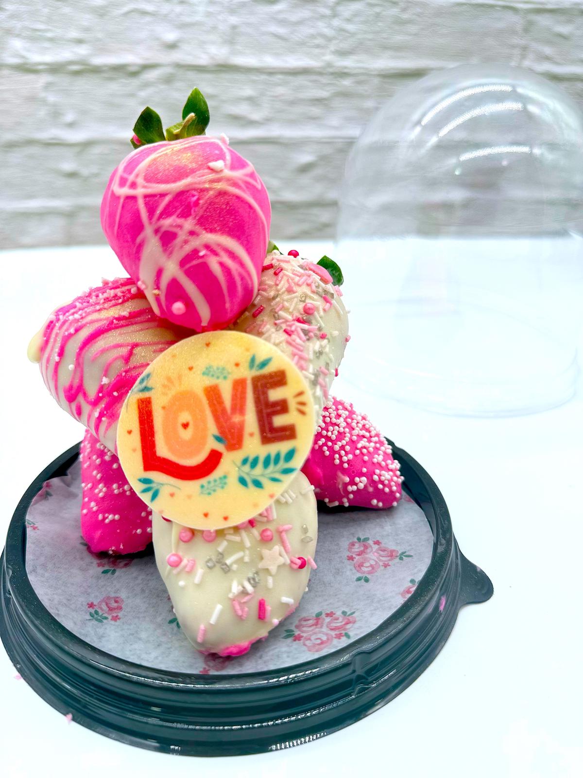 Deliciosas 6 fresas cubiertas de chocolate y decoradas, que van dentro de una cupula que las protege.