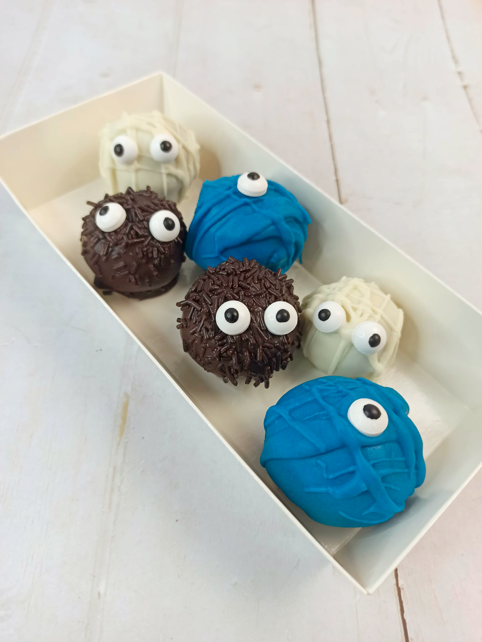 Cajita de 6 bomboncitos de bizcocho y dulce de leche, cubierto de chocolate, decorados con motivos de Halloween.